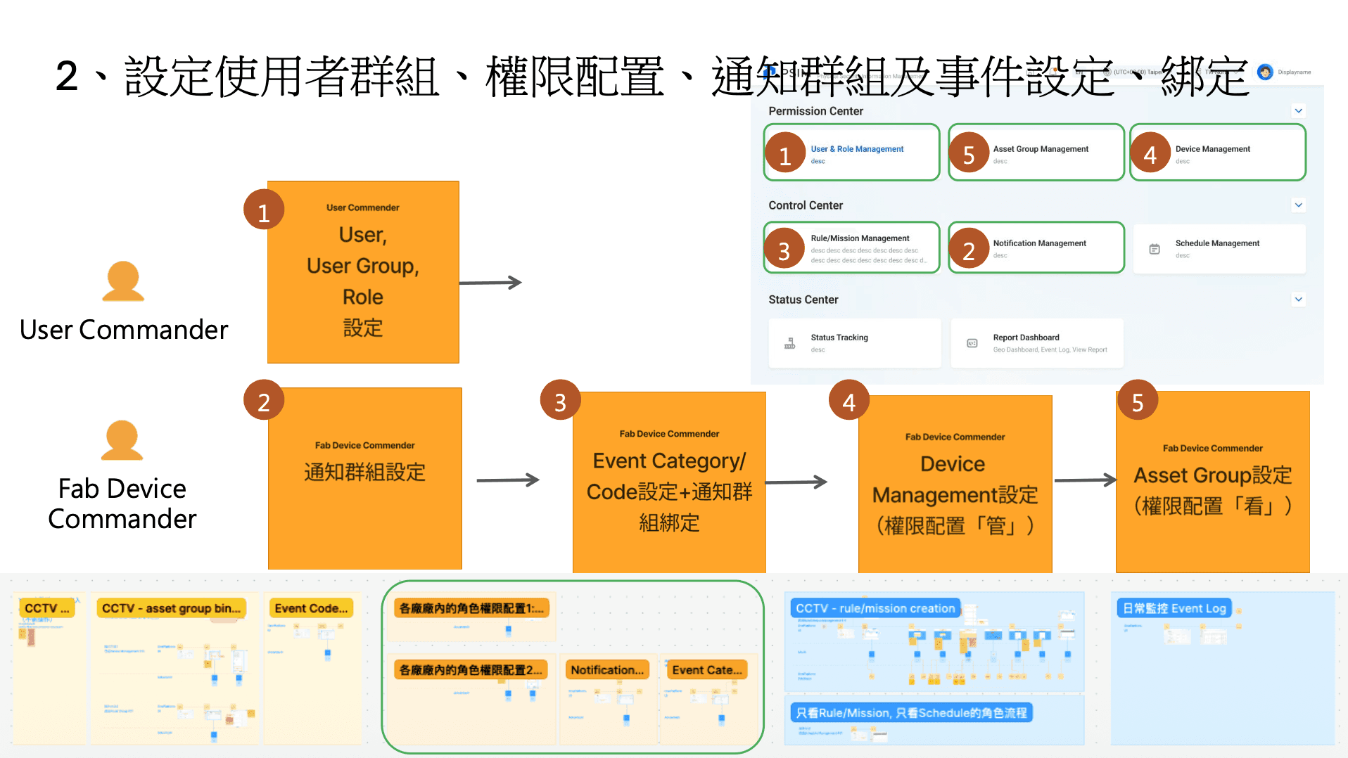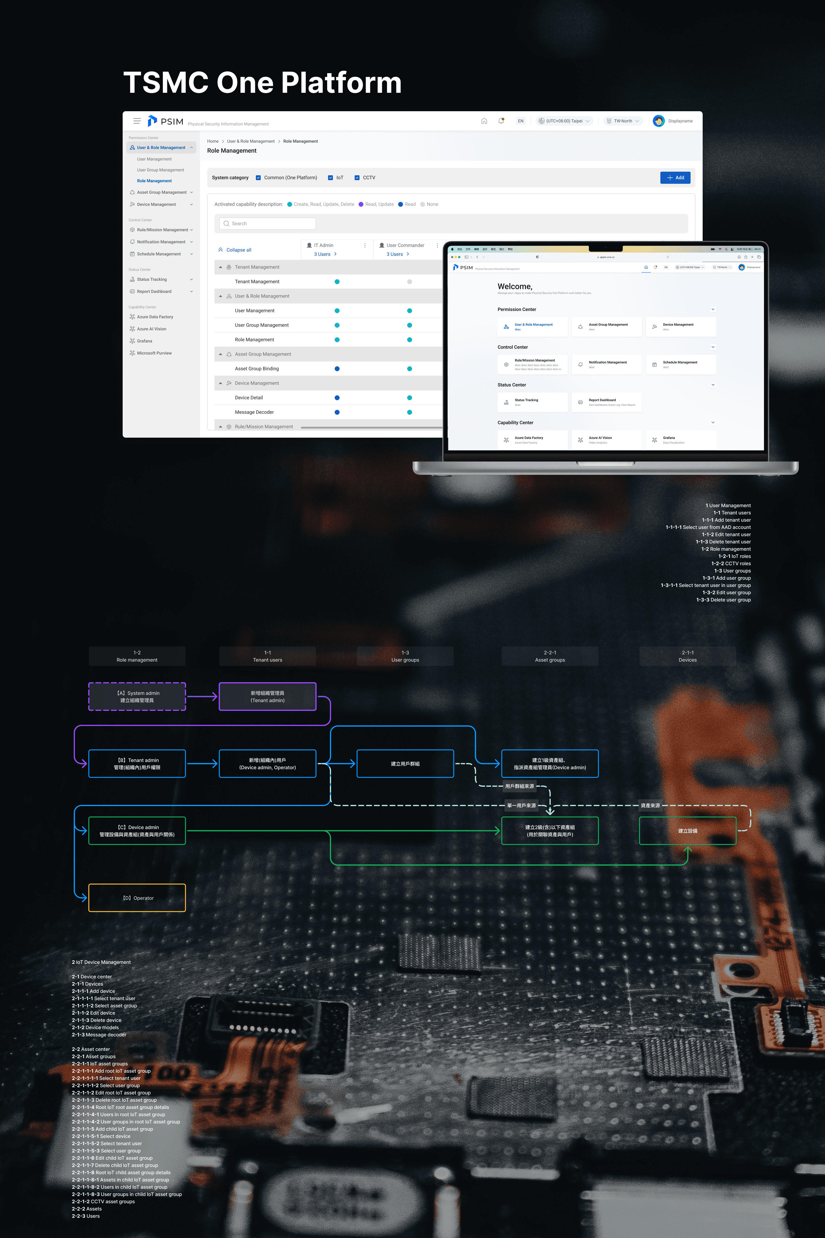 TSMC needed to consolidate their physical security operations — fragmented across legacy systems, manual processes, and disconnected monitoring tools — into a single platform. The initial brief covered CCTV management for one fab. Within months, the scope expanded to include a Control Center for real-time multi-site monitoring, a Status Center for system health tracking, Device Management for thousands of surveillance endpoints, Rule & Mission engines for automated security responses, a Permission Center with granular role-based access, and a comprehensive Report Dashboard.